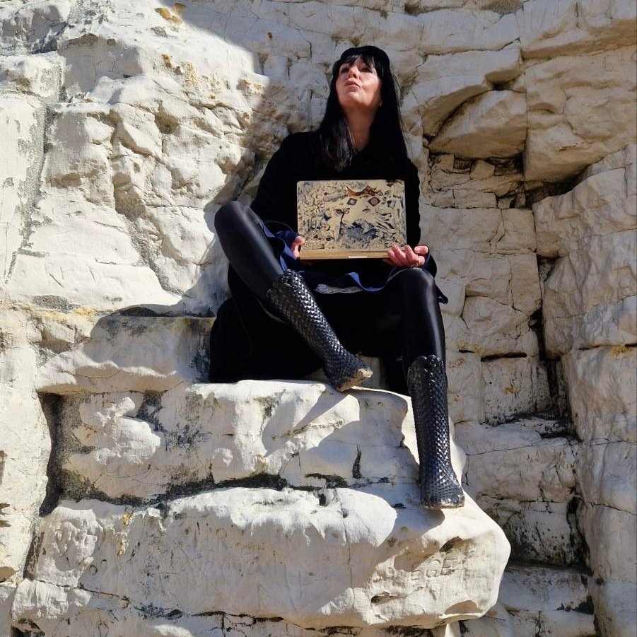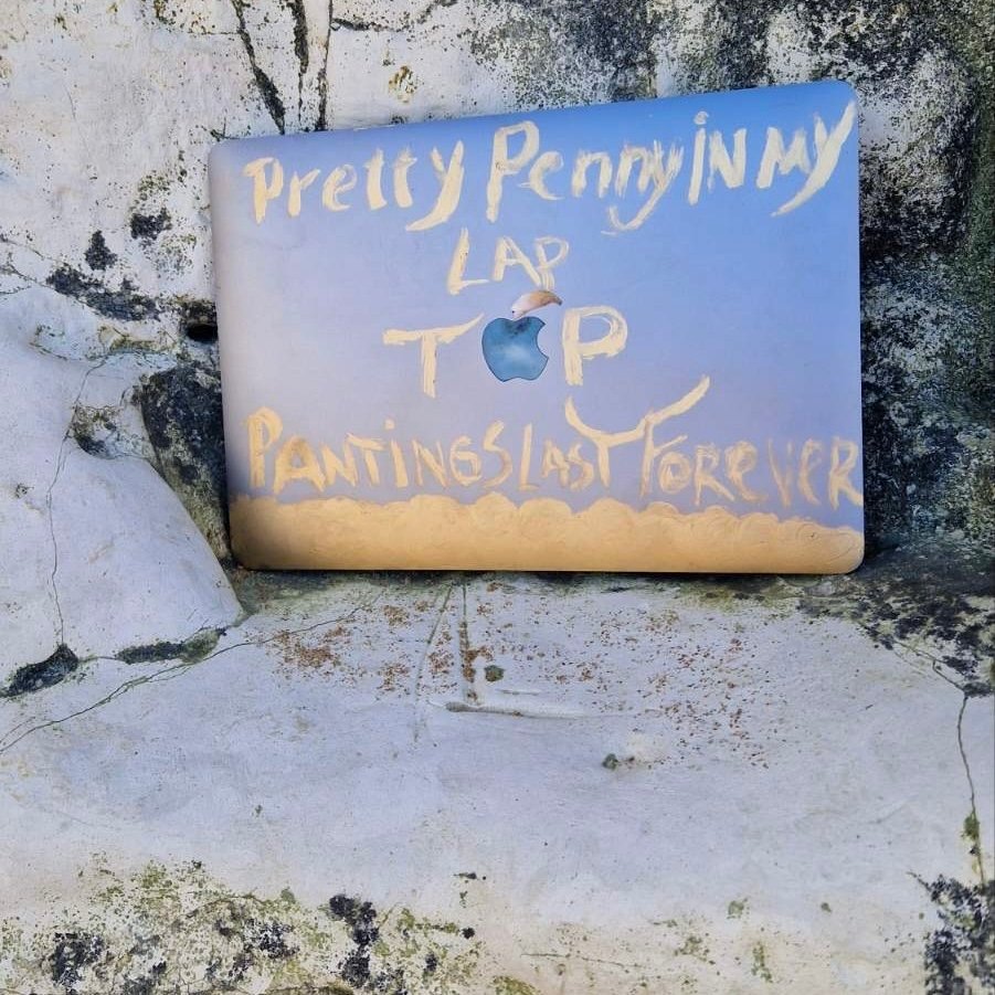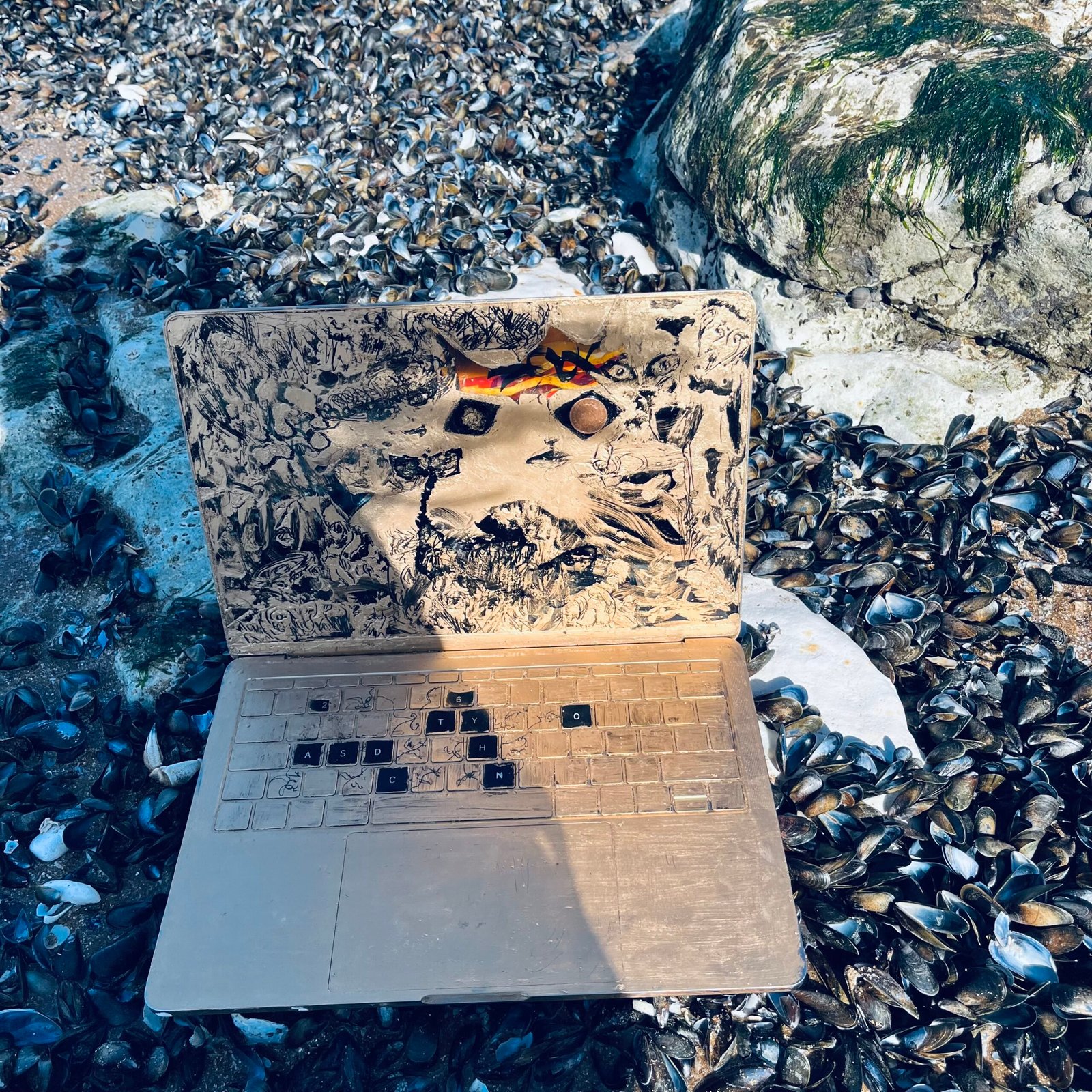 Acrylic and gold emulsion on MacBook. A working machine rendered obsolete by image, the screen replaced with surface, the keyboard with mark-making. One of a kind.